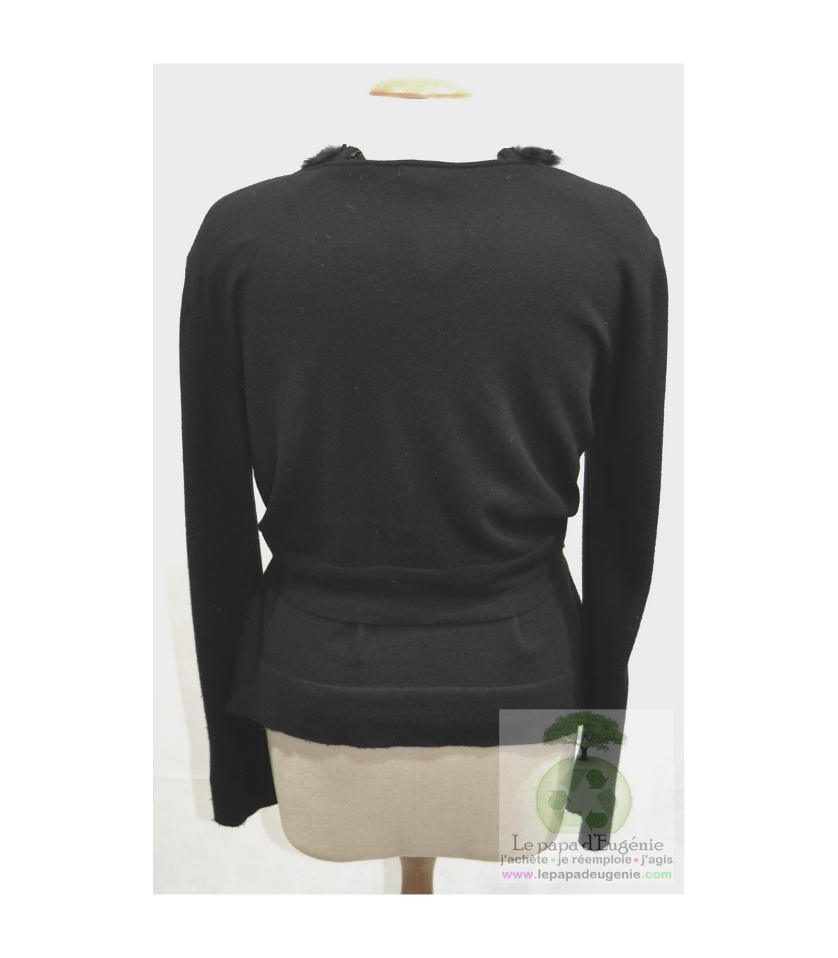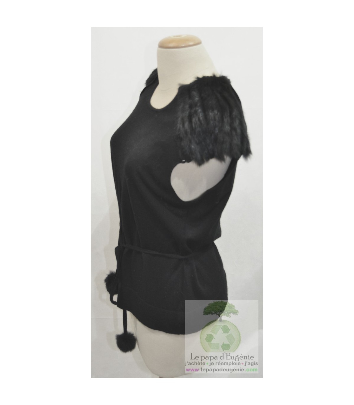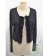 Caroline Biss - ensemble 2 pcs - Dame - noir - L-40 FR-T3 - parfait état comme neuf - composant(s) : laine, polyester, cashemire, fourrure lapin - Gilet-cardigan manches longues + top manches courtes - épaulettes et ponpons fourrure lapin